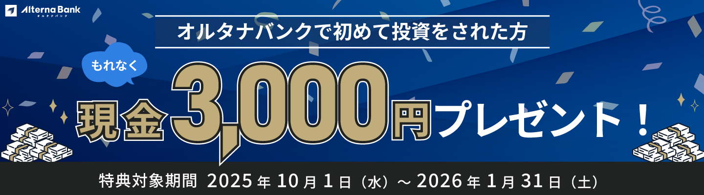 - オルタナバンクで初めて投資をすると、現金3,000円が貰える!